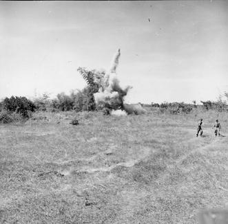 Operation Cedar Falls mission was to clear Viet Cong from the Iron Triangle near Saigon, RVN. The mission of C Company, 1st Battalion, 5th Mechanized Infantry, 2nd Brigade, 25th Infantry Division was to sweep through the Filhol Plantation in search of fleeing Viet Cong units. During the sweep an anti-tank mine was found and destroyed. Two demolition experts using TNT detonate the mine in a safe area. Photo by Robert C. Lafoon US Army Sp Photo Det, Pacific