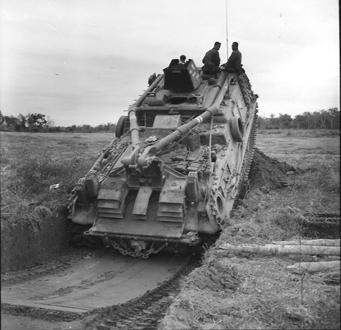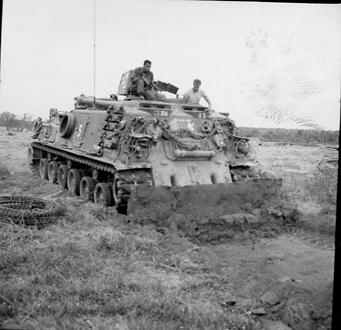 Operation Cedar Falls mission was to clear Viet Cong from the Iron Triangle near Saigon, RVN. On 8 January 1967, Troop B 3rd Squadron, 4th Cavalry, 25th Infantry Division joined the operation and became a blocking force along the Saigon River in the Filhol Plantation. M88 Vehicle Track Retriever, using a bulldozer type blade, prepares foxhole emplacement to be used by one of the squadron's armored vehicles. Photo by Robert C. Lafoon US Army Sp Photo Det, Pacific