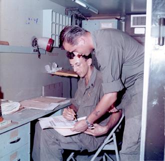 CC 66934 Nha Trang, Vietnam CIVIL OPERATIONS AND RURAL DEVELOPMENT SUPPORT SFC Duong-Than-Xuan and 1LT Vo-Van-Khoa, working with the US 8th Psyops Det, plan a new layout for a propaganda leaflet. 29 April-1 May 1970 Photo by SP4 Joel M. Shanus USA Sp Photo Det, Pac Unclassified by USAPA, 26 June 70