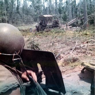 CC 67279 VIETNAM LAND CLEARING OPERATIONS 1LT Tom Peck (Concord, NH) mans a .50 caliber machine gune mounted on an M-113 Armored Personnel Carrier as he provides security for rome plows of the 588th Eng Bn. 21 April 1970 Photo by SP4 Joel M. Shanus USA Sp Photo Det, Pac UNCLASSIFIED by USAPA, 6 July 70