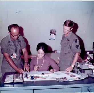 CC 66936 Nha Trang, Vietnam Civil Operations and Rural Development Support Miss Nguyen-Thi, illustrator, talks over a new idea for a propaganda leaflet with SGT Rogers (left) and SP5 Larry Ellingsen (Seattle, Wash), illustrator, at the 8th Psyops Det. 29 April-1 May 1970 Photo by SP4 Joel M. Shanus USA Sp Photo Det, Pac Unclassified by USAPA, 26 June 1970