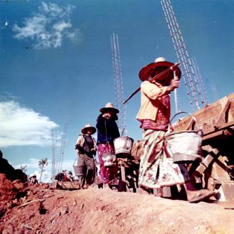 CC 73488 Chieng-Mai, Thailand RTA PACK MULE SQUADRON Thai women carry buckets of cement during construction of a new Headquarters Building at the 2nd RTA Breeding Station at Mae-Rim. 9-10 May 1970 Photo by SP4 Joel M. Shanus USA Sp Photo Det, Pac Unclassified by USAPA, 3 Feb 1971