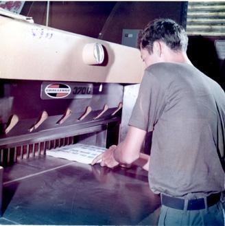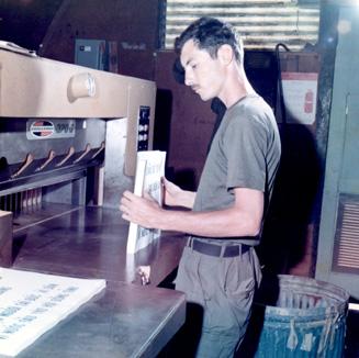 CC 66947 Nha Trang, Vietnam CIVIL OPERATIONS AND RURAL DEVELOPMENT SUPPORT SP4 Philip Labranch (Springfield, Mass), Co 'A', 8th Psyops Det, prepares to cut completed posters at the printing shop. 29 April-1 May 1970 Photo by SP4 Joel M. Shanus USA Sp Photo Det, Pac Unclassified by USAPA, 26 June 70