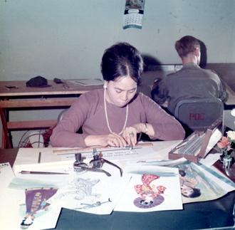 CC 66933 Nha Trang, Vietnam Civil Operations and Rural Development Support Miss Nguyen-Thi, illustrator at the 8th Psyops Det, works on some paintings to be used for new propaganda leaflets. 29 April-1 May 1970 Photo by SP4 Joel M. Shanus USA Sp Photo Det, Pac Unclassified by USAPA, 26 June 1970