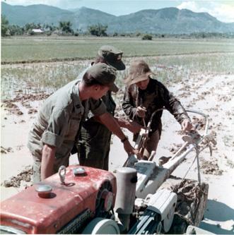 CC 67957 Dien Toan, Vietnam CORDS ACTIVITIES CPT William Shambacker, US Army Advisor and the village chief, explain the operation of the rotor tiller to a Vietnamese farmer. 26-29 May 1970 Photo by SP4 Joel M. Shanus USA Sp Photo Det, Pac Unclassified by USAPA, 16 July 1970