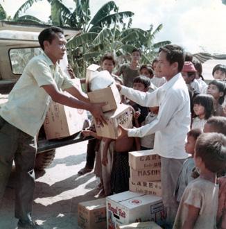 CC 67955 VIETNAM CORDS ACTIVITES The Phillipine advisor hands out CARE packages at Cu Thanh/Cam Lam. The packages contain small tools, sewing machines, games and writing books. 26-29 May 1970 Photo by SP4 Joel M. Shanus USA Sp Photo Det, Pac Unclassified by USAPA, 16 July 70
