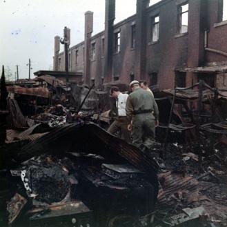 CC 69521 YONGSAN, KOREA FIRE AT THE YONGSAN MAIN PX SGT Albert M. Cork, military policeman and managers of the PX look over the ruins of the warehouse where electronics gear was stored. 10 Jul 1970 Photo by SP4 Joel M. Shanus USA Sp Photo Det, Pac UNCLASSIFIED by USAPA, 26 Aug 70