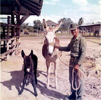 CC 73477 CRIENG-MAI, THAILAND RTA PACK MULE SQUADRON An RTA veterinary specialist brings out a 'Jennet' female donkey and her foal for inspection at the 2nd RTA Breeding STation at Mae-Rim. 9-10 Dec 1970 Photo by SP4 Joel M. Shanus USA Sp Photo Det, Pac UNCLASSIFIED by USAPA, 3 Feb 71