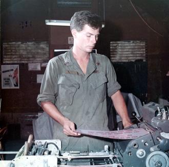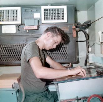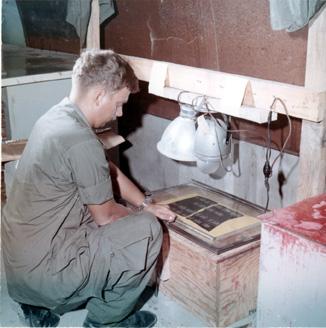 CC 66941 NHA TRANG, VIETNAM CIVIL OPERATIONS AND RURAL DEVELOPMENT SUPPORT SP5 Albert Turner (Spring Valley, N.Y.), Co 'A', 8th Psyops Det, works over a light table on a new layout in the printing shop. 29 April-1 May 1970 Photo by SP4 Joel M. Shanus USA Sp Photo Det, Pac UNCLASSIFIED by USAPA, 26 June 70