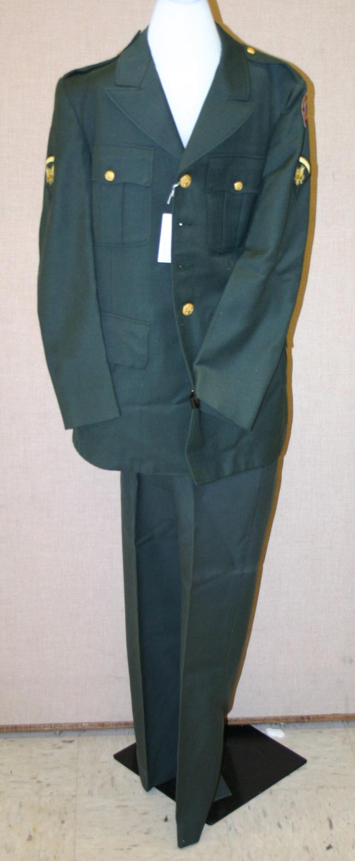 Class A U.S. Army uniform, jacket and trousers. Jacket has Specialist 2 rank and Army Services Force patches sewn on left sleeve