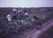 An Giang farmer harvests IR-8 rice while a photo crew looks on.