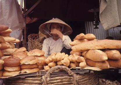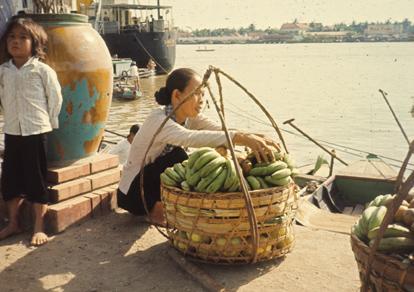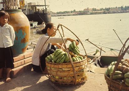 Vietnam Markets - Banana vendor handing bananas down to boat people