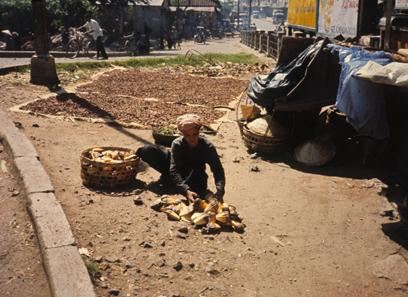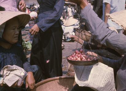 Vietnam Markets - Vendor weighs garlic and other spices for sale