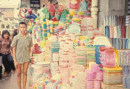 Vietnam Markets - Store selling plastic containers and fabric bolts in rear