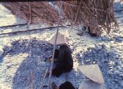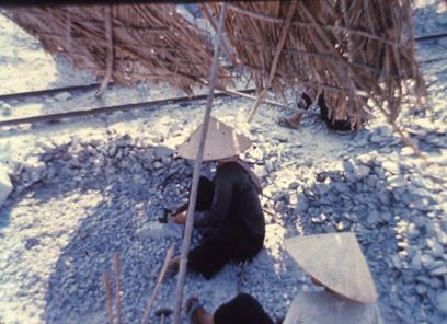 Person wearing a conical hat gathering rocks