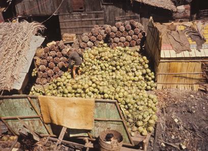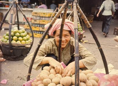 Vietnam Markets - Woman picks up fruit to put in basket