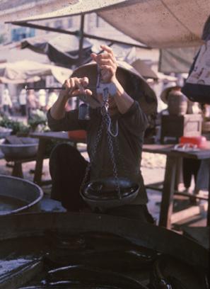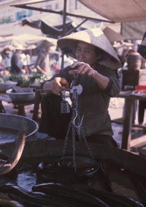 Vietnam Markets - Woman weights eels or fish for buyer