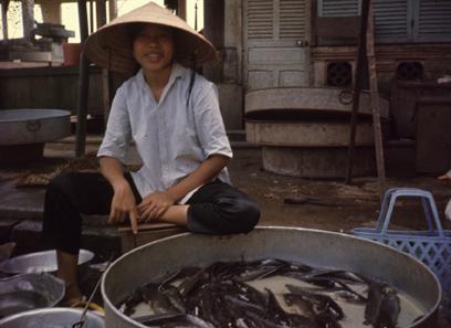 Vietnam Markets - Woman vendor with tub of fish to sell