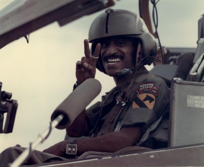 Sammy Davis, Jr., sitting in cockpit of Huey Cobra helicopter.