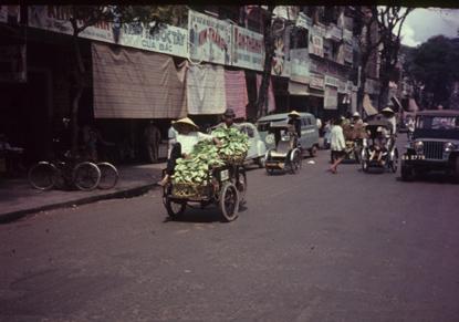 Getting Vietnam's Crops to Market - Push cart fighting city traffic by Catholic Church on a busy Saigon street, trying to get the sugar cane to market.