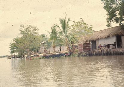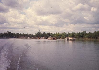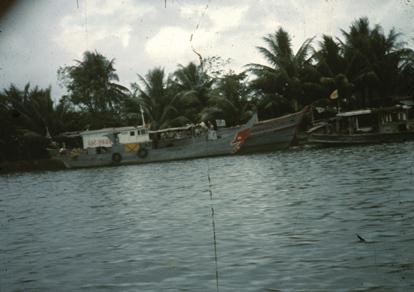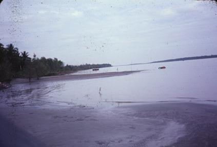 Vietnam Waterways - Low tide with low water and boats grounded along the shore. The tide reached to Saigon. House boats and trade boats would have to wait until high tide to float again.
