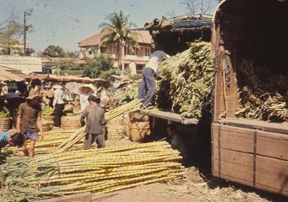 Getting Vietnam's Crops to Market - Two trucks off loading sugar cane at market, in background other vendors selling oranges can be seen.