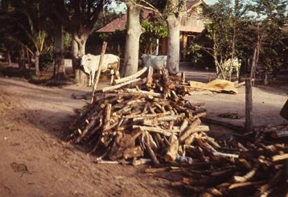 Getting Vietnam's Crops to Market - Stacks of wood ready to go to market, with oxen in background.