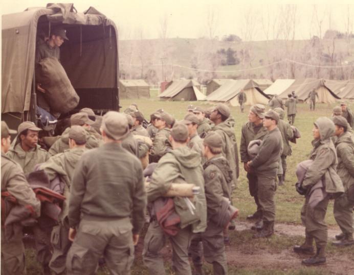CC 89047 New Zealand. Operation Pacific Bond. Members of the 2nd Platoon, B Company, 1st Battalion, 35th Regiment, picking up their baggage from the truck. 9 June-18 July 1973. Photo by SFC Frank J. Salas, US Army Spec Photo Det, PAC. Unclassified by USAAVA(1) 25 Oct 73 swj