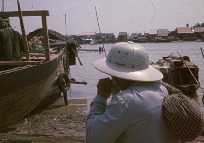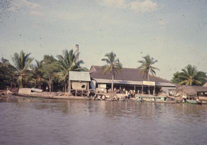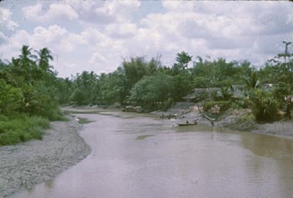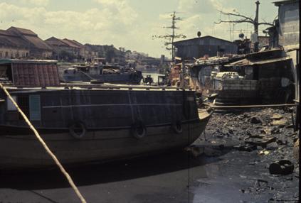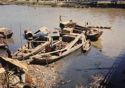Vietnam Waterways - Low tide with low water and boats grounded along the shore. The tide reached to Saigon. House boats and trade boats would have to wait until high tide to float again.