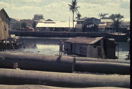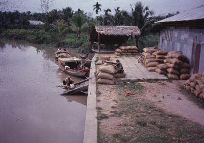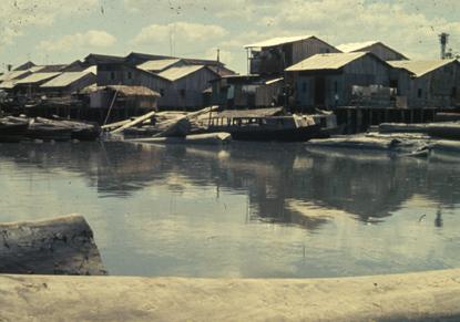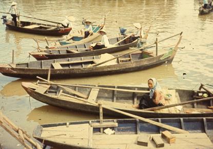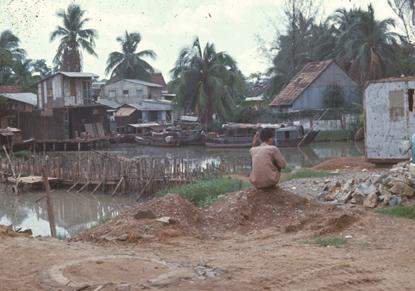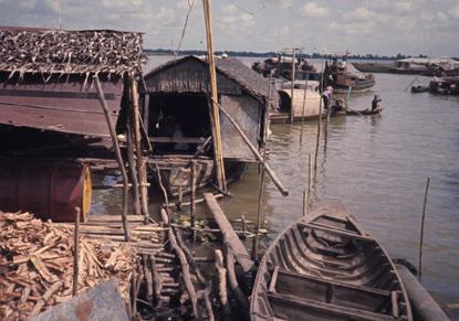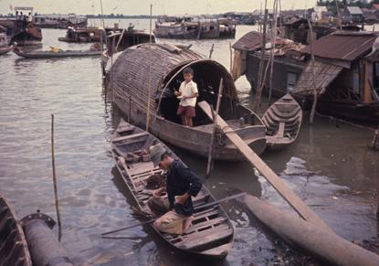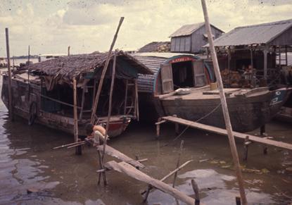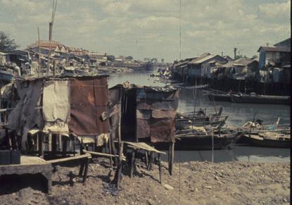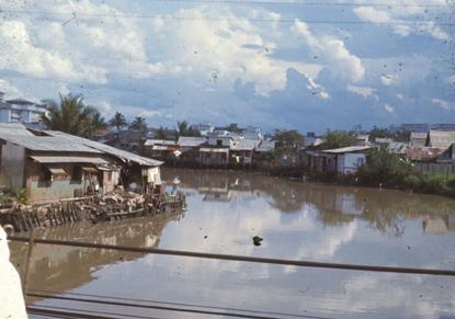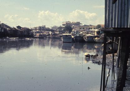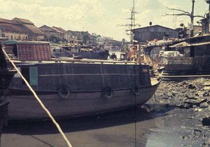 Vietnam Waterways - Has crowded conditions with many sampans, house boats, and cramped living space along the canals and streams. Some boats are tied up two or three boats deep. Most look like they are just trying to find a place to dock. - Saigon suburbs