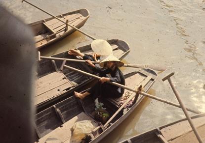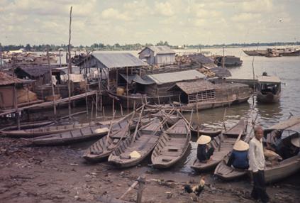 Vietnam Waterways - Has crowded conditions with many sampans, house boats, and cramped living space along the canals and streams. Some boats are tied up two or three boats deep. Most look like they are just trying to find a place to dock.