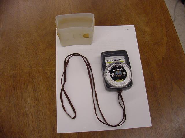 Lunasix 3 Light meter with neck cord and one half of the plastic carrying case.