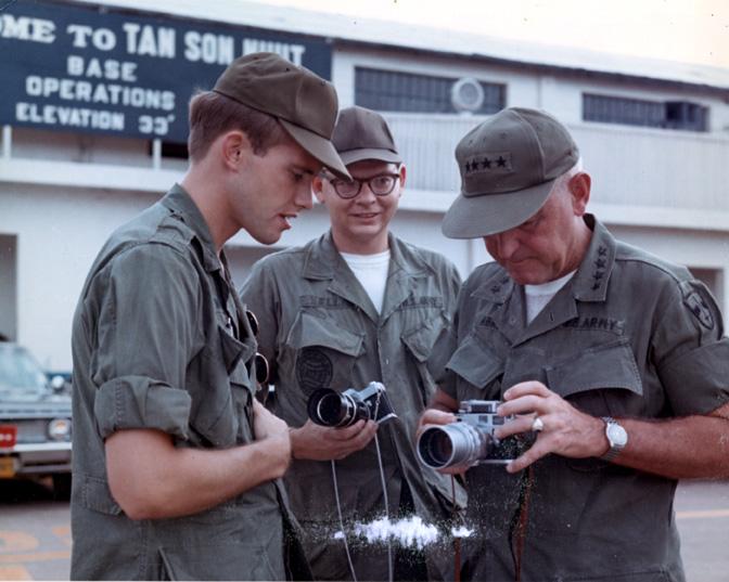 Arrival of the Secretary of the US Army in Vietnam Gen. Creighton W. Abrams, COMUSMACV, talks with 1LT Thomas H. Wilson (Des Moines, Iowa), OIC, DASPO Team 'C', and SSG Robert R. Ellis (Takoma Park, Md), NCOIC, DASPO Team 'C', about the camera equipment that members of the DASPO Team use while waiting for the arrival of the Secretary of the Army Stanley R. Resor at the Tan Son Nhut Air Base. Photo by SP5 Thomas L. Larsen US Army SP Photo Det, Pac
