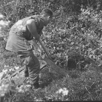 Soldier takes the opportunity to have a smoke during a rest break. Photo by Robert C. Lafoon US Army Sp Photo Det, Pacific