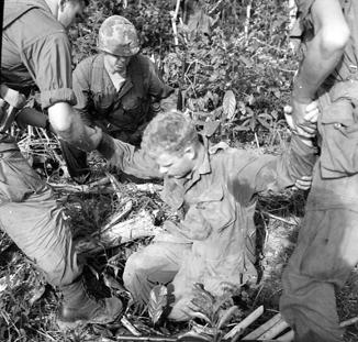 Two soldiers assist the tunnel rat out of a Viet Cong tunnel he just searched. Photo by Robert C. Lafoon US Army Sp Photo Det, Pacific