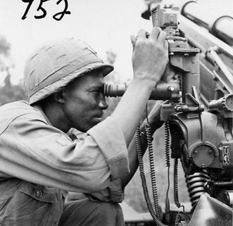 Artillery battery soldier sets the sights on his 105mm cannon as the unit prepares to do a fire mission against a Viet Cong position Photo by Robert C. Lafoon US Army Sp Photo Det, Pacific