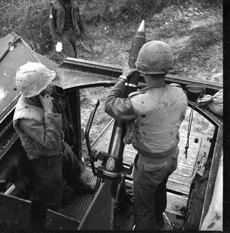Two crew members drop a round into the tube of a 4.2mm mortar mounted in the rear of a M113 Armored Personnel Carrier. The section was firing at a Viet Cong held position. Photo by Robert C. Lafoon US Army Sp Photo Det, Pacific