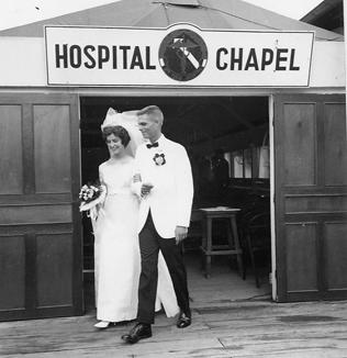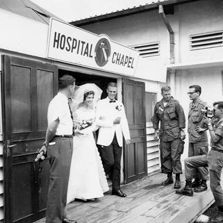 A wedding between a doctor and nurse takes place within a hospital's chapel. Bride and groom leave the chapel after the ceremony. Photo by Robert C. Lafoon US Army Sp Photo Det, Pacific