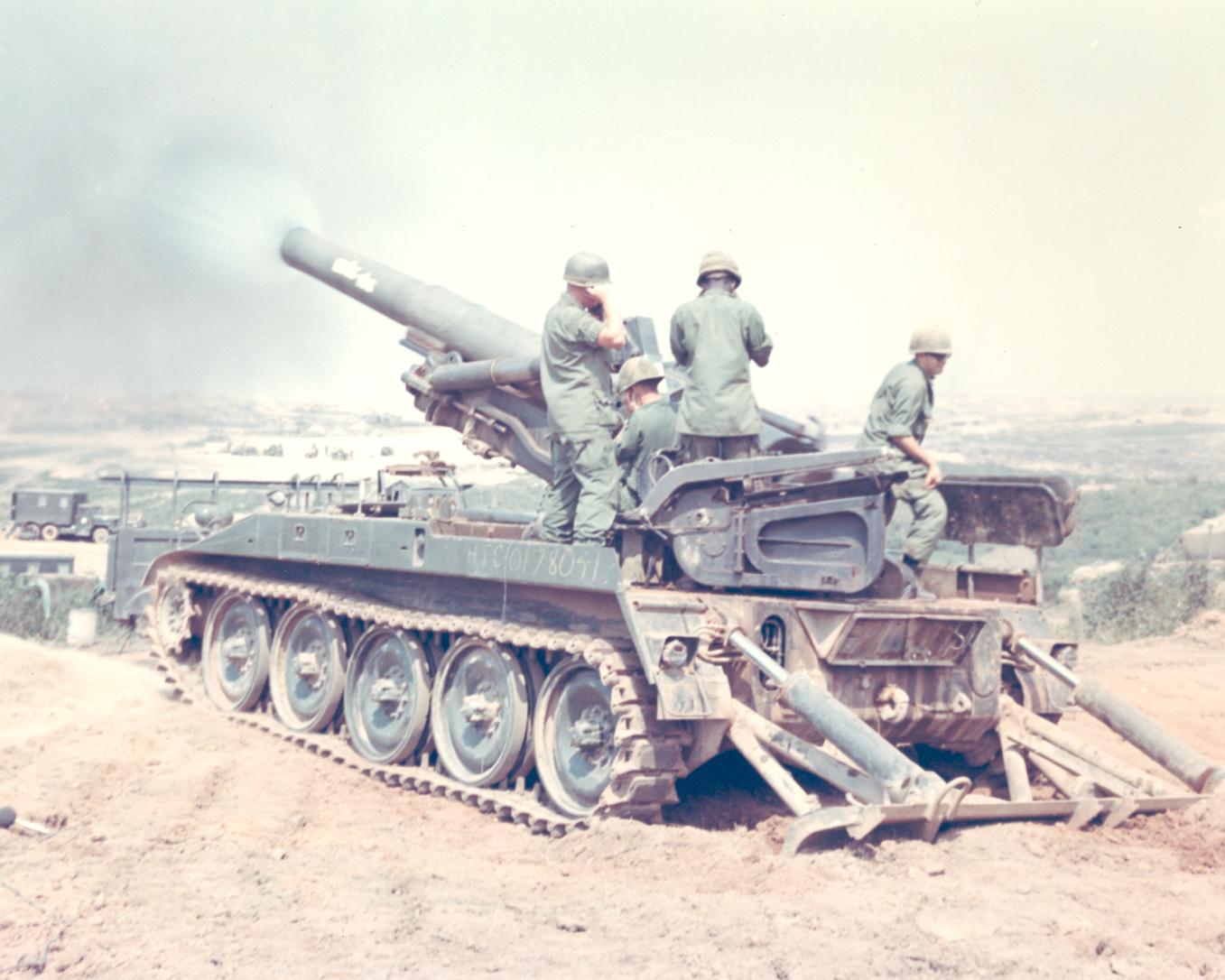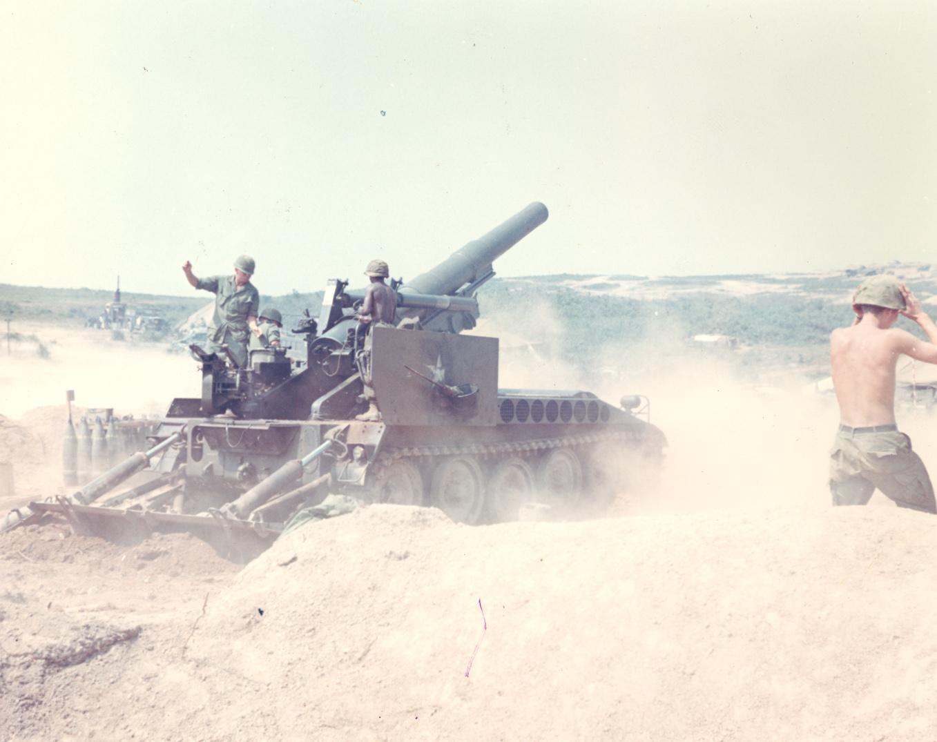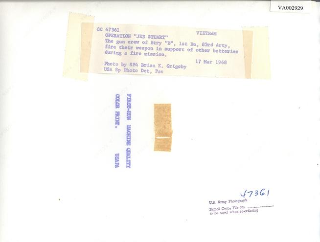 Operation 'Jeb Stuart' The gun crew of Btry. 'B', 1st Bn, 83rd Arty, fire their weapon in support of other batteries during a fire mission.