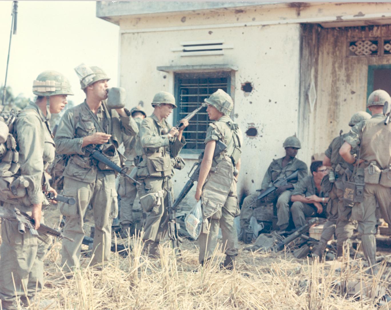 Combat Operations of the 1st Inf. Div. Members of Co 'B', 2nd Bn, 18th Inf, wait beside a deserted farm house to be air-lifted from the area.