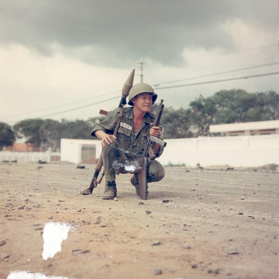 ARVN troops repell NVA/VC attack on Saigon. A member of the 7th ABn. Bn, 1st ARVN Abn Div, takes up his position near the wall of the French National Cemtery, located on the western perimeter of the Tan Son Nhut Air Base. 6 May 1968 Photo by SP4 Bryan K. Grigsby US Army Sp Photo Det, Pac