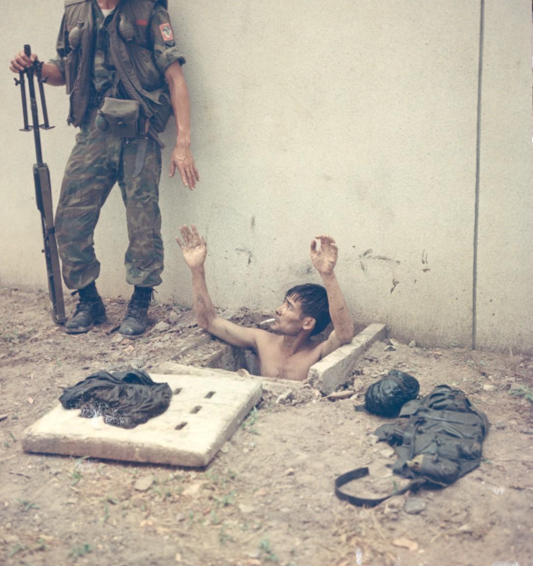 ARVN Airborne repell NVA/VC attack. A captured VC from the 104th Bn, 762nd Regt, 9th NVA/VC Div, comes out of hiding in a sewer drainage system under a house. 6 May 1968 Photo by SP4 Bryan K. Grigsby USA Sp Photo Det. Pac