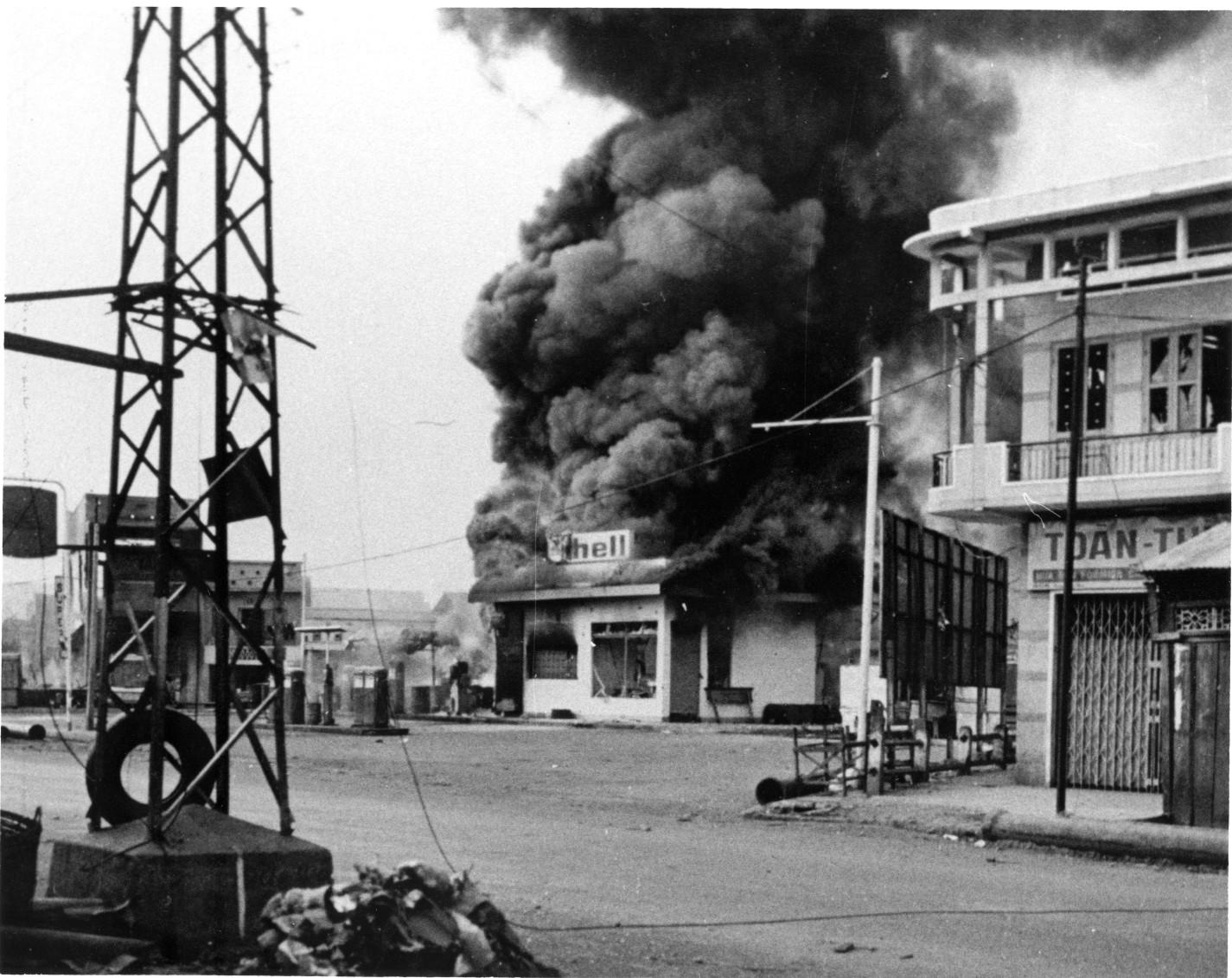 6 May 1968 - Photo by SP4 Bryan Grigsby (DASPO) - Burning Shell Station on Plantation Rd in Gia Dinh, a suburb of Saigon. This site had been the scene of an engagement between 1st ARVN Airborne & a combined N. Vietnamese-Viet Cong force. This action was part of what became known as the Post-Tet Offensive or the May Offensive of 1968.