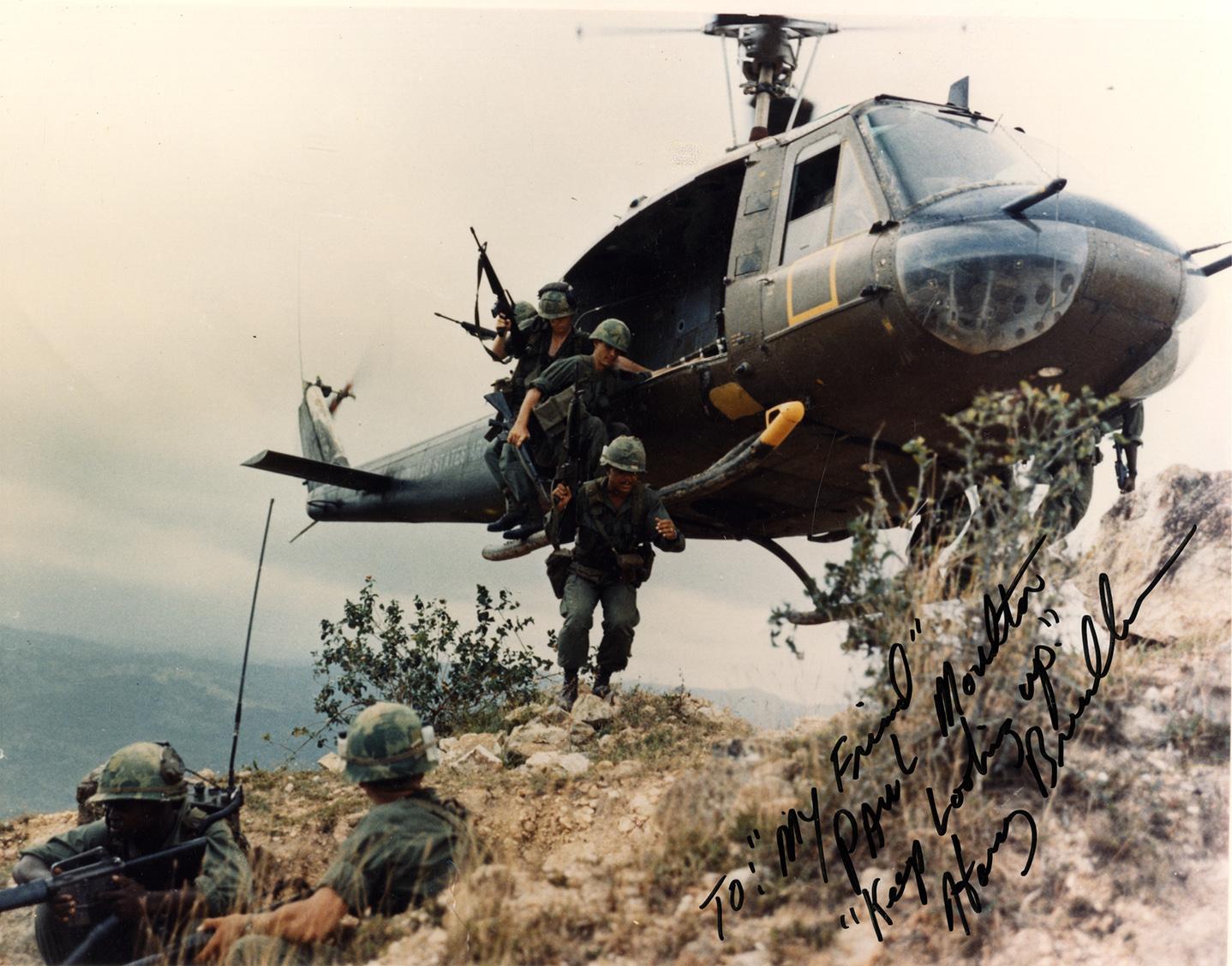 Operation Oregon, a search and destory mission conducted by an infantry platoon of Troop B, 1st Recon Squadron, 9th Cavalry, 1st Cavalry Division, three kilometers west of Duc Pho, Quang Nhai Province. Members of the reconnaisance platoon are dispatched from a helicopter hovering above the ridge line. Inscription in black marker: To "My Friend" Paul L. Moulton "Keep looking up." Harry Breedlove