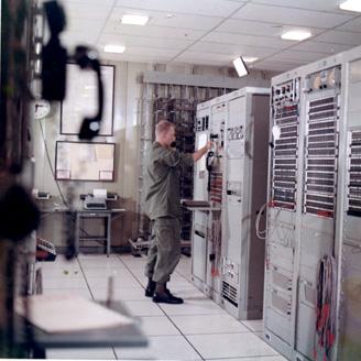 CC 73371 THAILAND, GREEN HILL COMMUNICATIONS COMPLEX - SP4 Vaughn Dade (Hiram, Ohio), fixed station technician, Co A, 442nd Signal Battalion, 29th Signal Group, receives information by telephone on the 'express order wire system' at the signal site in Khao Yai National Park.