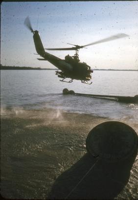 Chinook helicopter carrying a Huey helicopter at Vinh Long