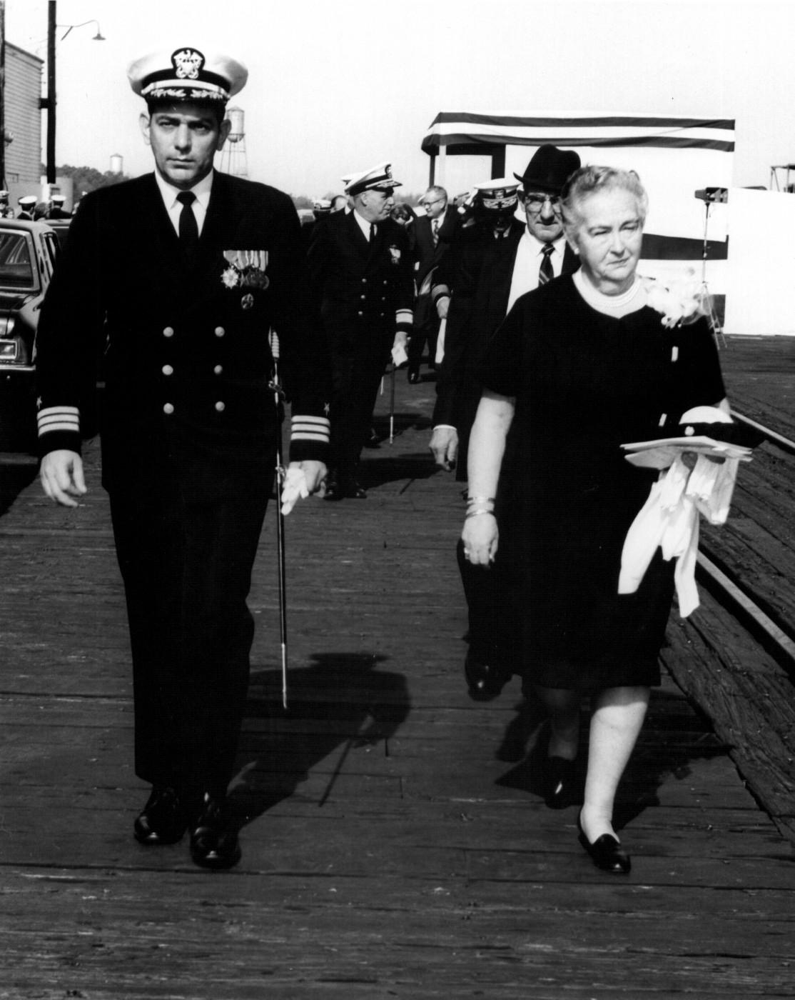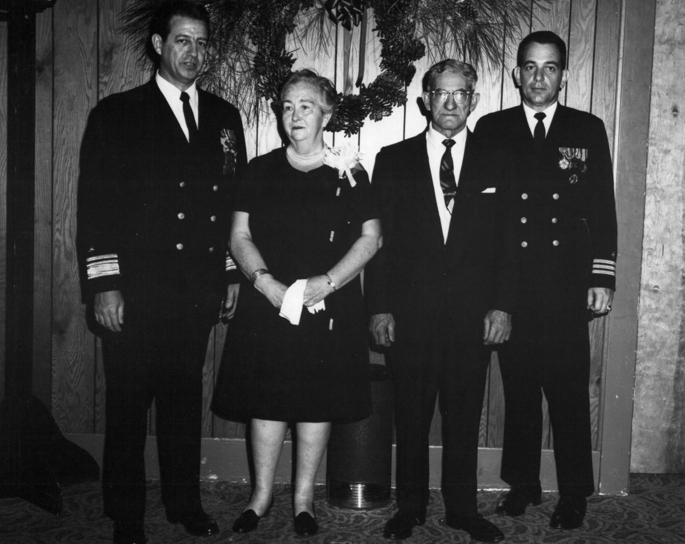 Left to Right E.H. Tidd, RADM, USN, Mrs and Mr. Chester Ouellet, A.l. Henry, CDR, USN, Commanding Officer.