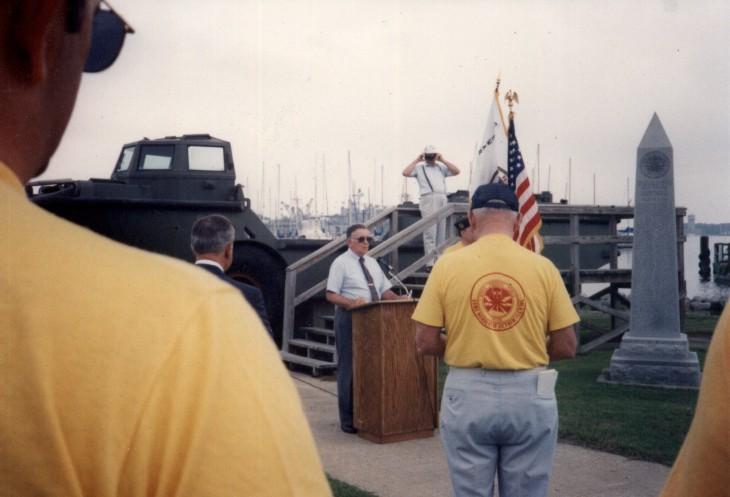 A.L. Henry, CDR, USN Commanding Officer, USS Ouellet, standing at podium.