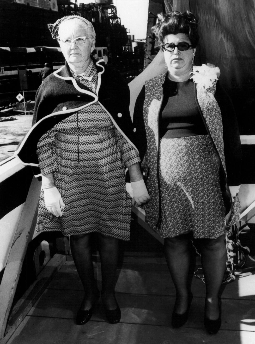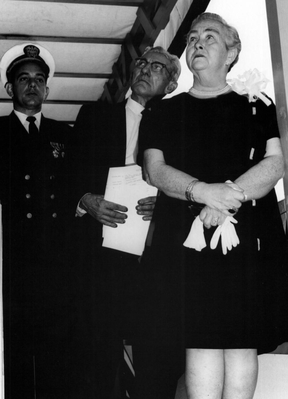 Mrs Fleeder Fail (left), mother of the late BMC Q.H. Truett, and Mrs. G. Truett Walter, (right) ship's sponsor and widow of Chief Truett, are pictured during the launching ceremonies of Truett (DE 1095). Truett's hull mounted sonar dome is visible in the background.