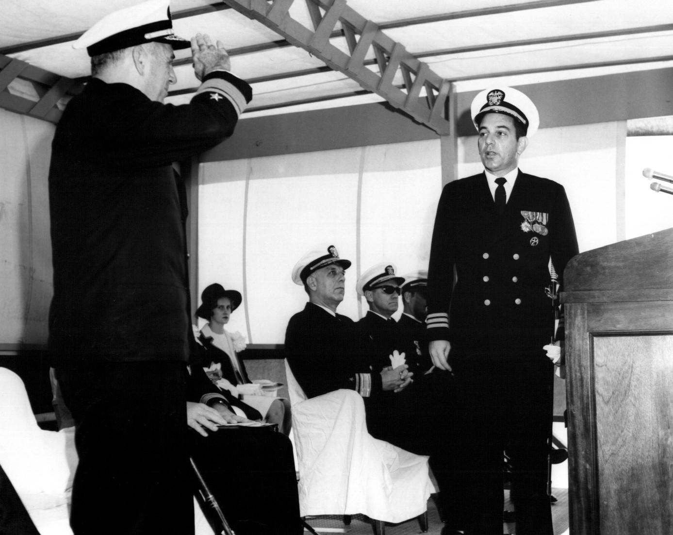 A.L. Henry, CDR, USN Commanding Officer, USS Ouellet, being saluted.